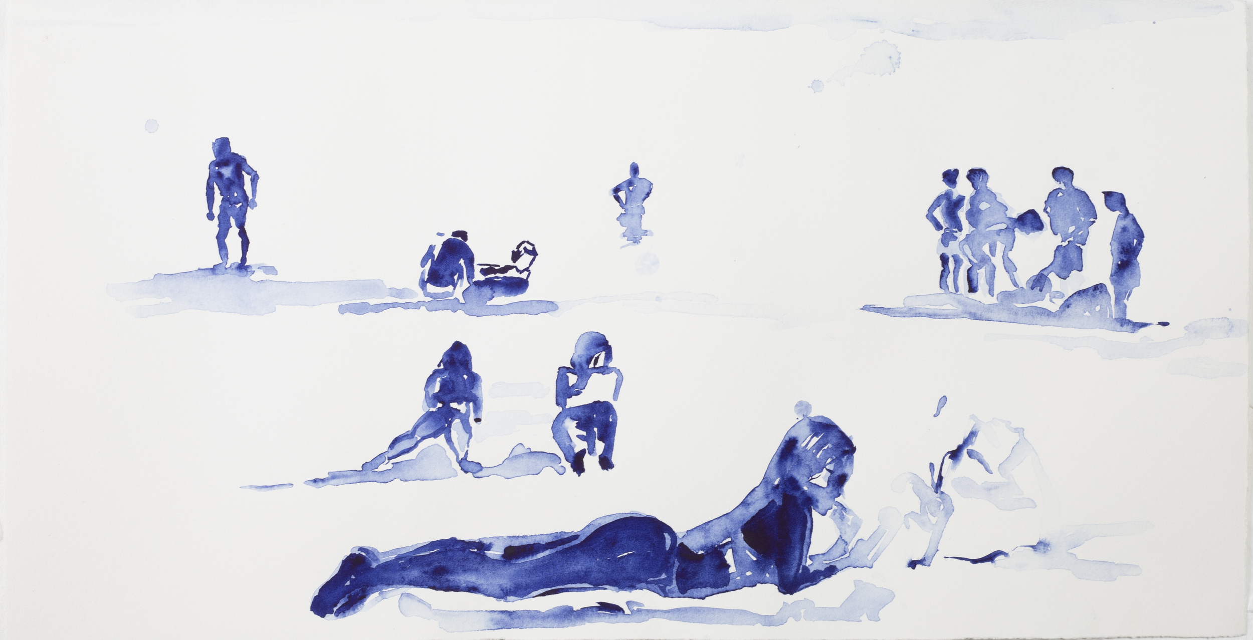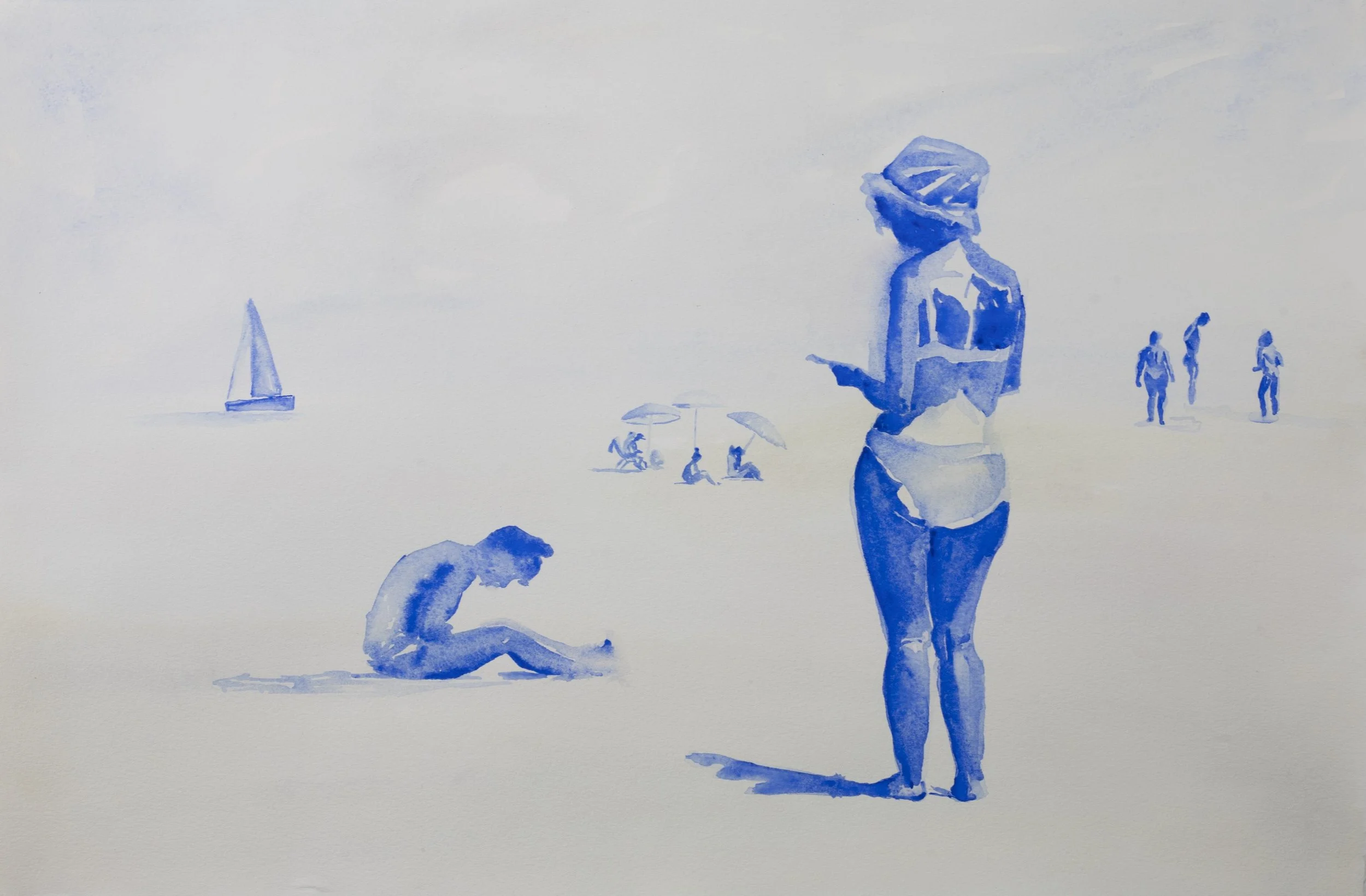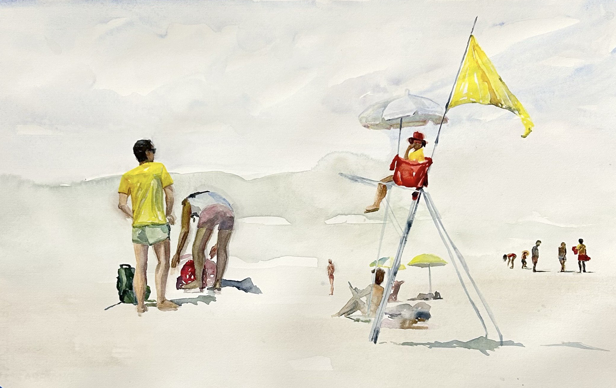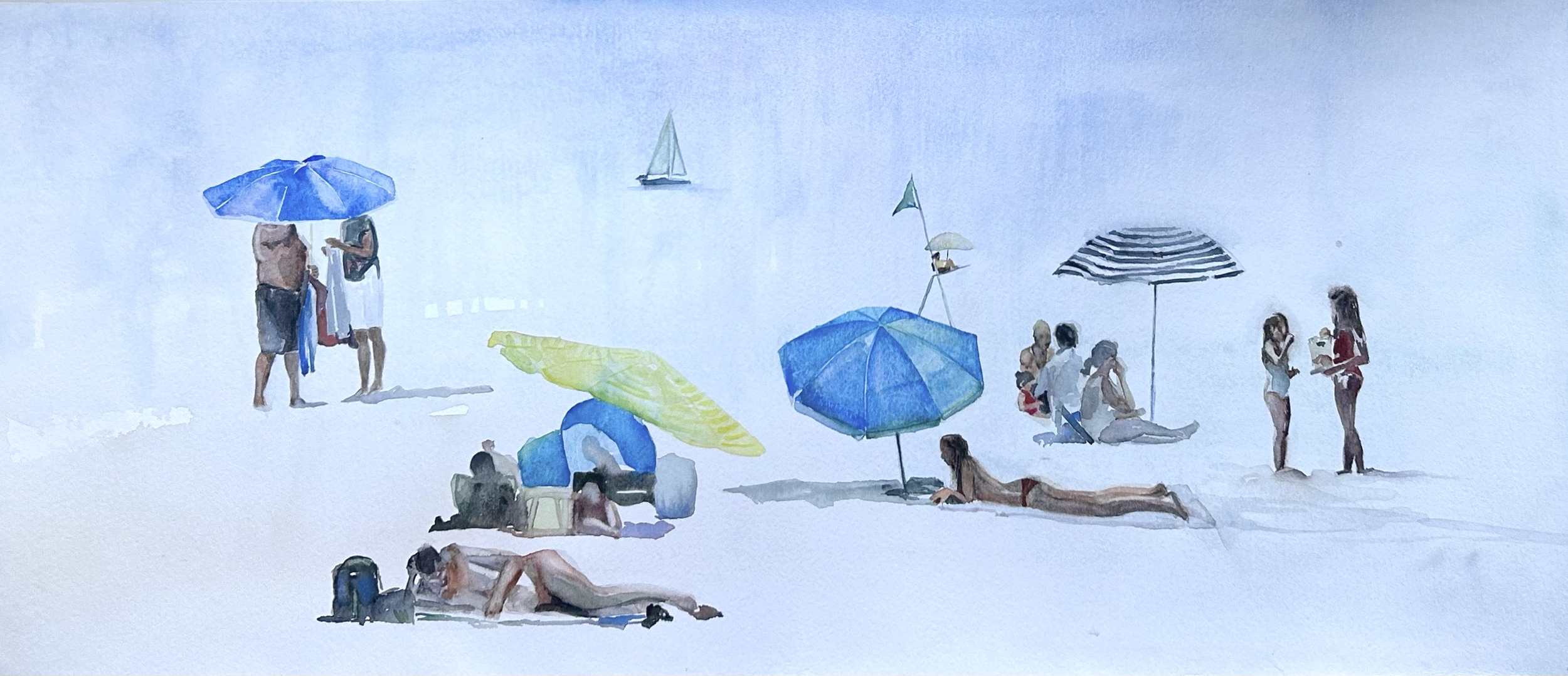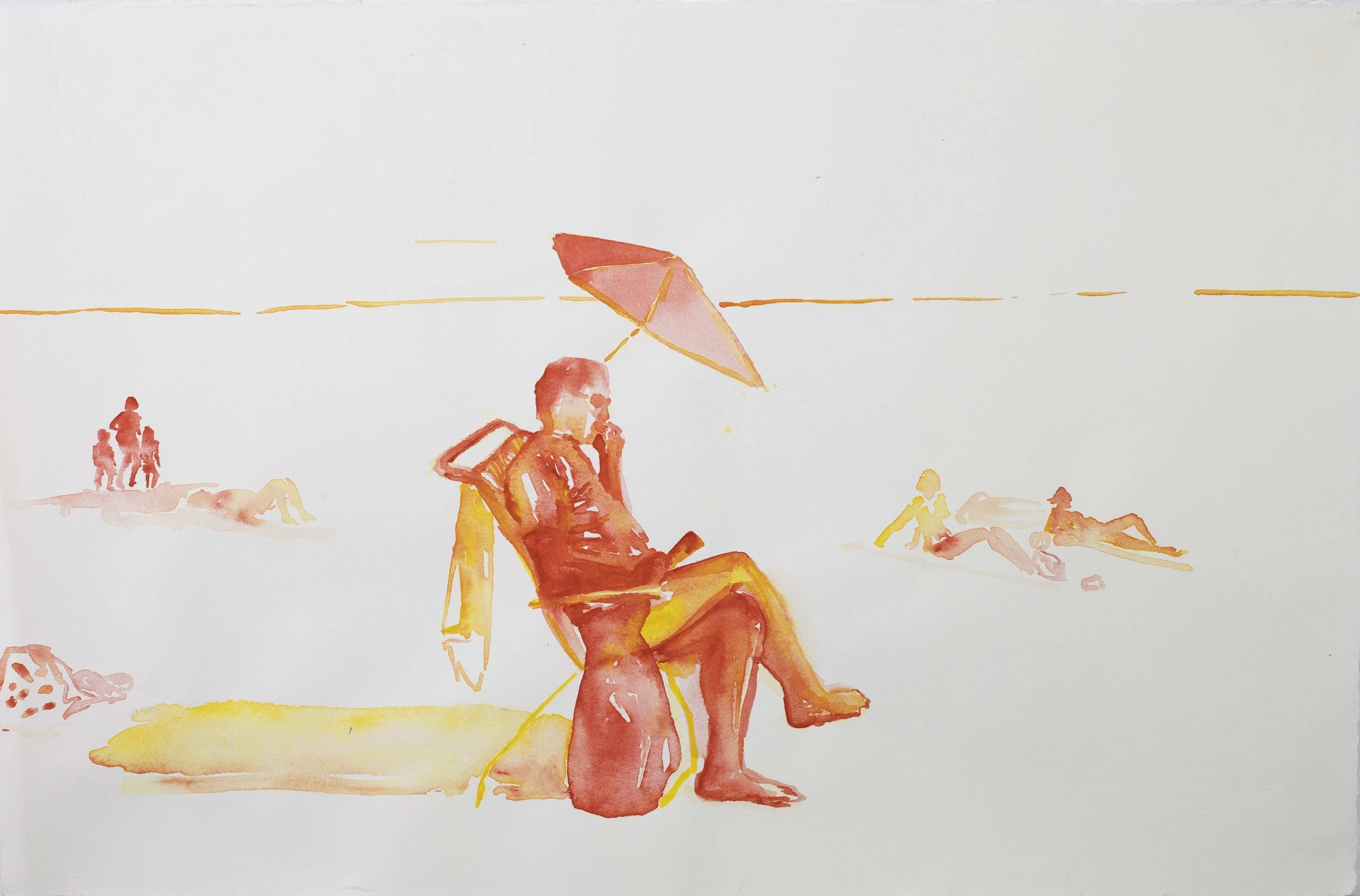 The watercolor series ‘Dolce Far Niente: Beach Idelness’ captures the serene beach scenes where people engage in casual activities, embracing moments of relaxation, reading books, immersing themselves in their phones, playing ball games, and relishing the beauty of simply being – the sweet idleness of beach life.
